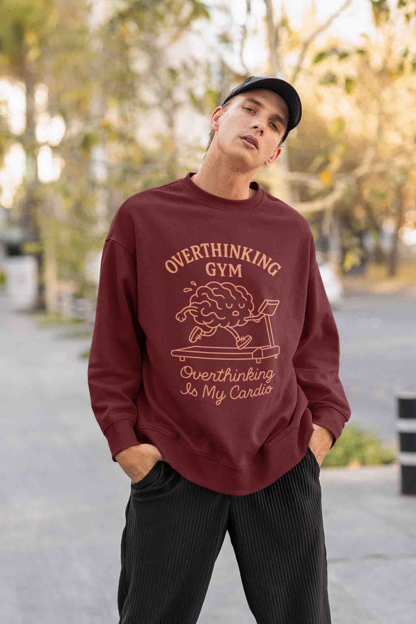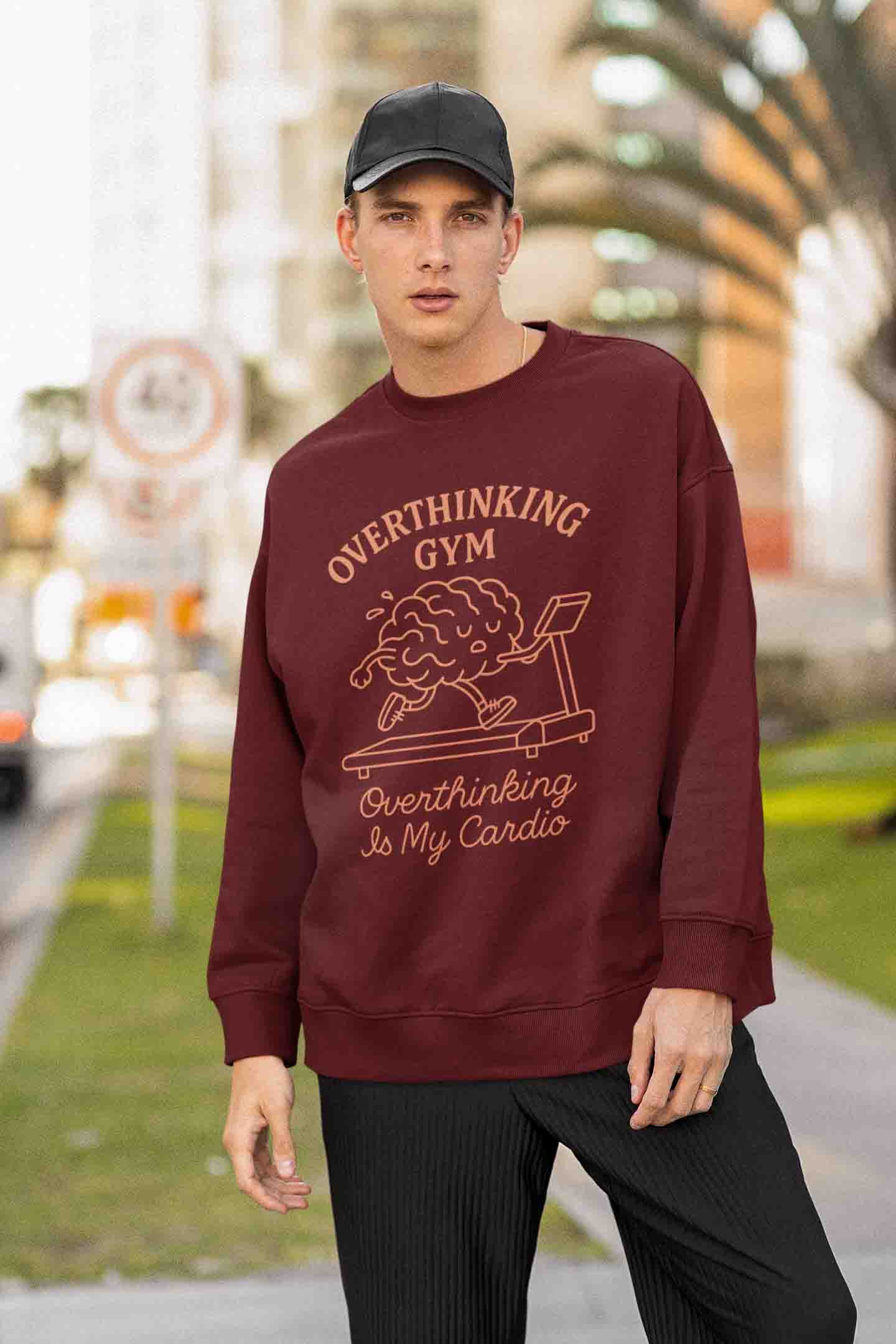 Overthinking Gym—because your brain does cardio too. Cozy maroon sweatshirt with a witty graphic for everyday overachievers.