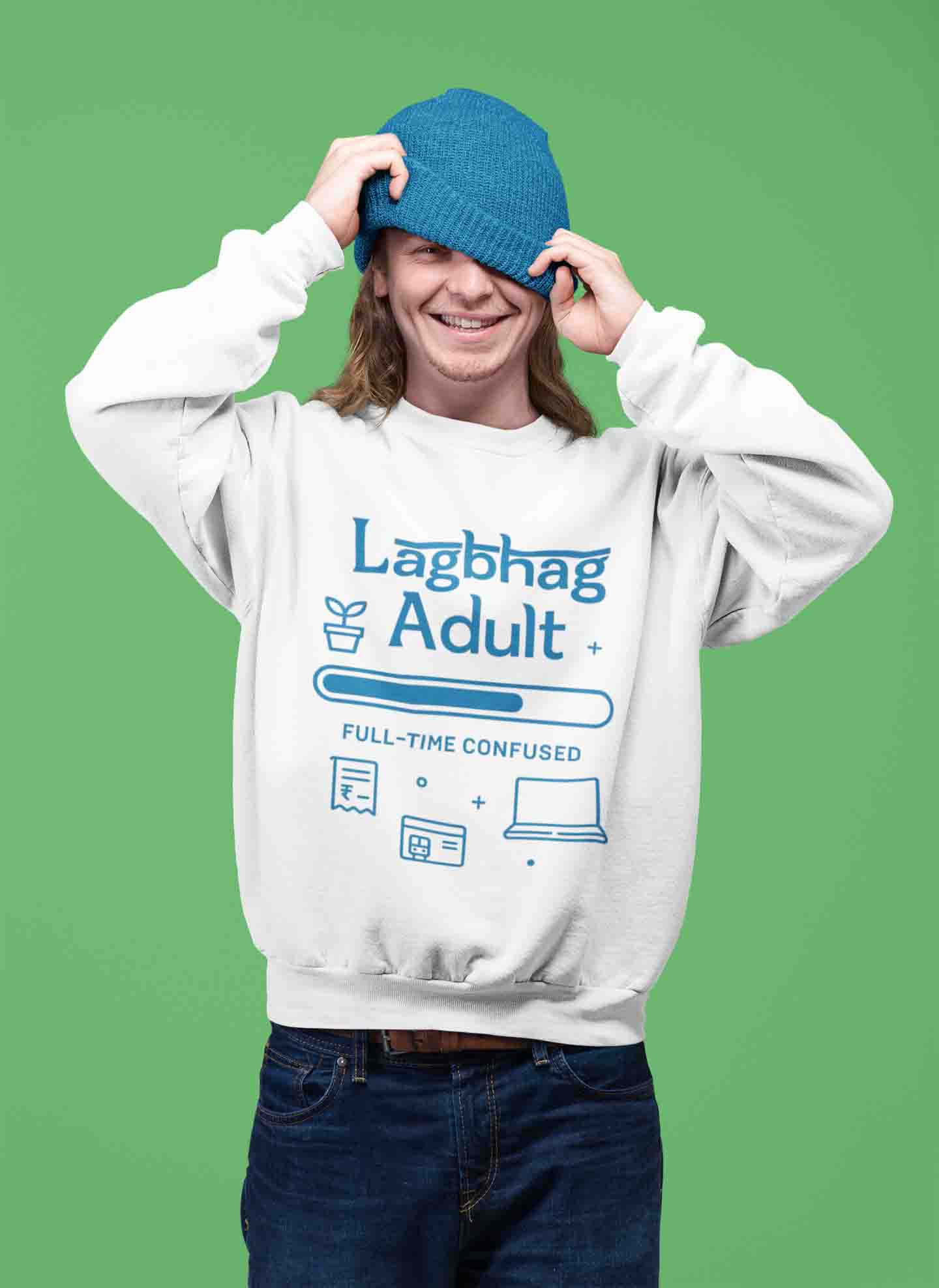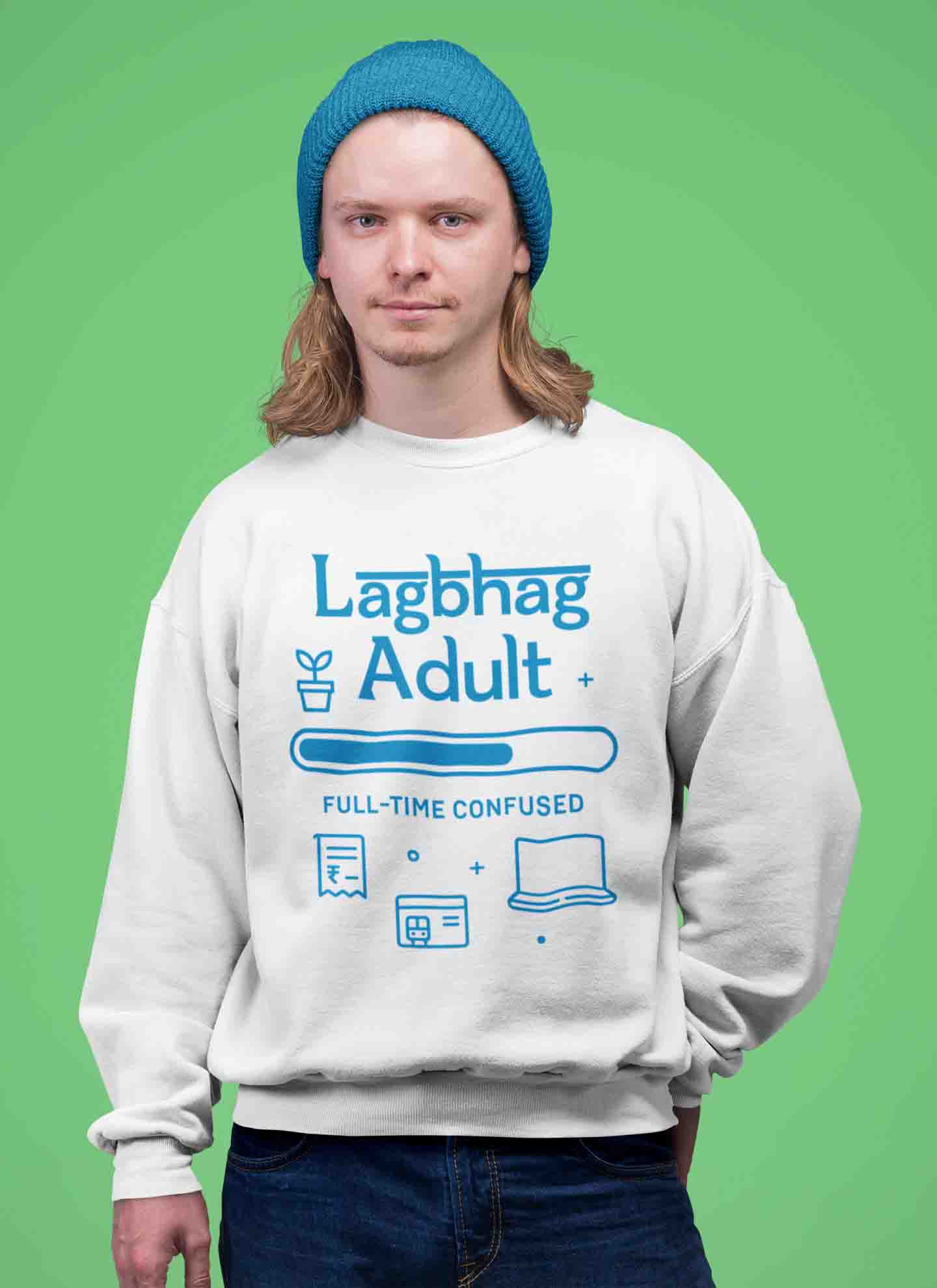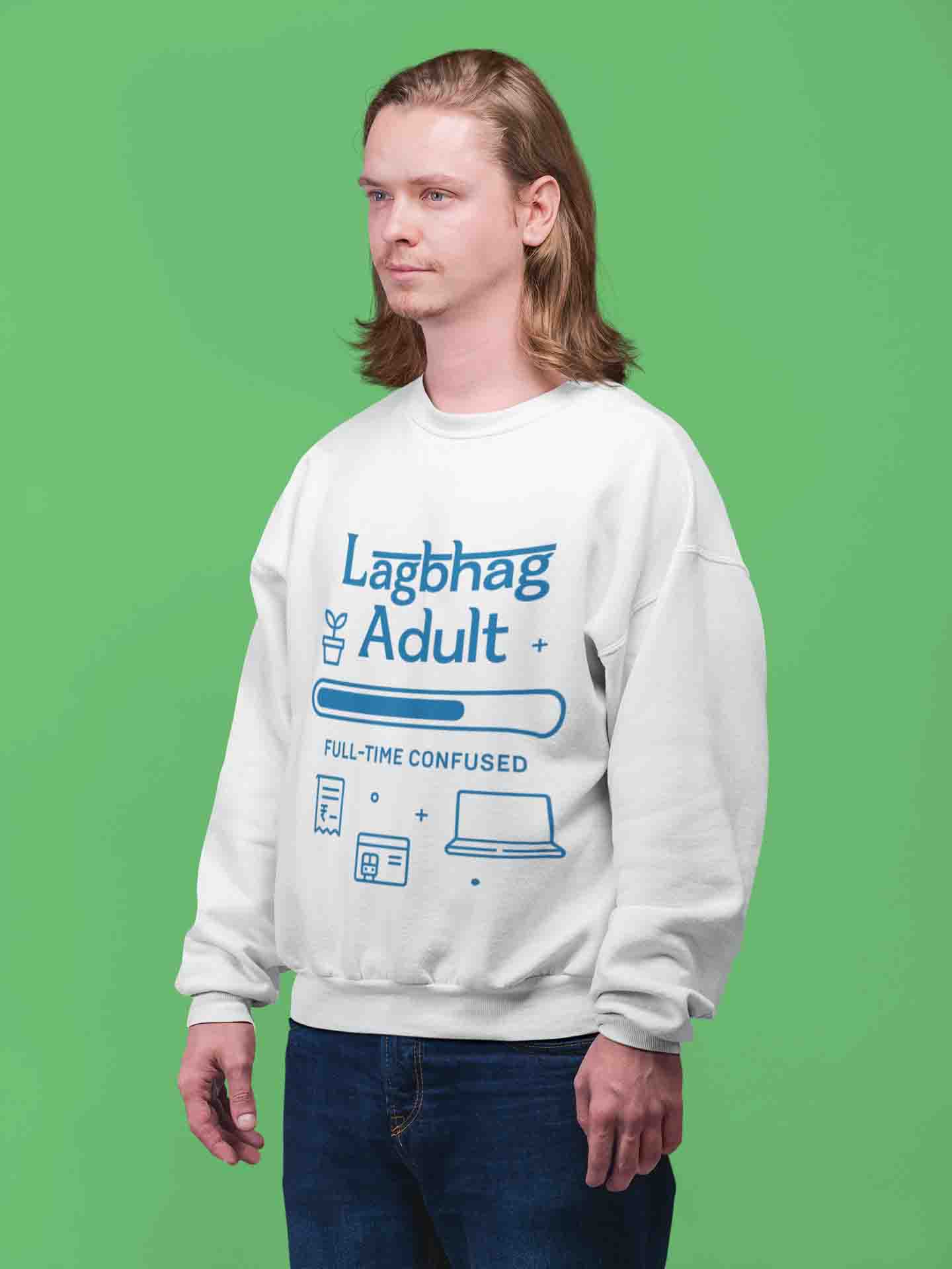 Men’s white sweatshirt with “Lagbhag Adult” print—soft, comfy, and painfully relatable. For the full-time confused (aka everyone).