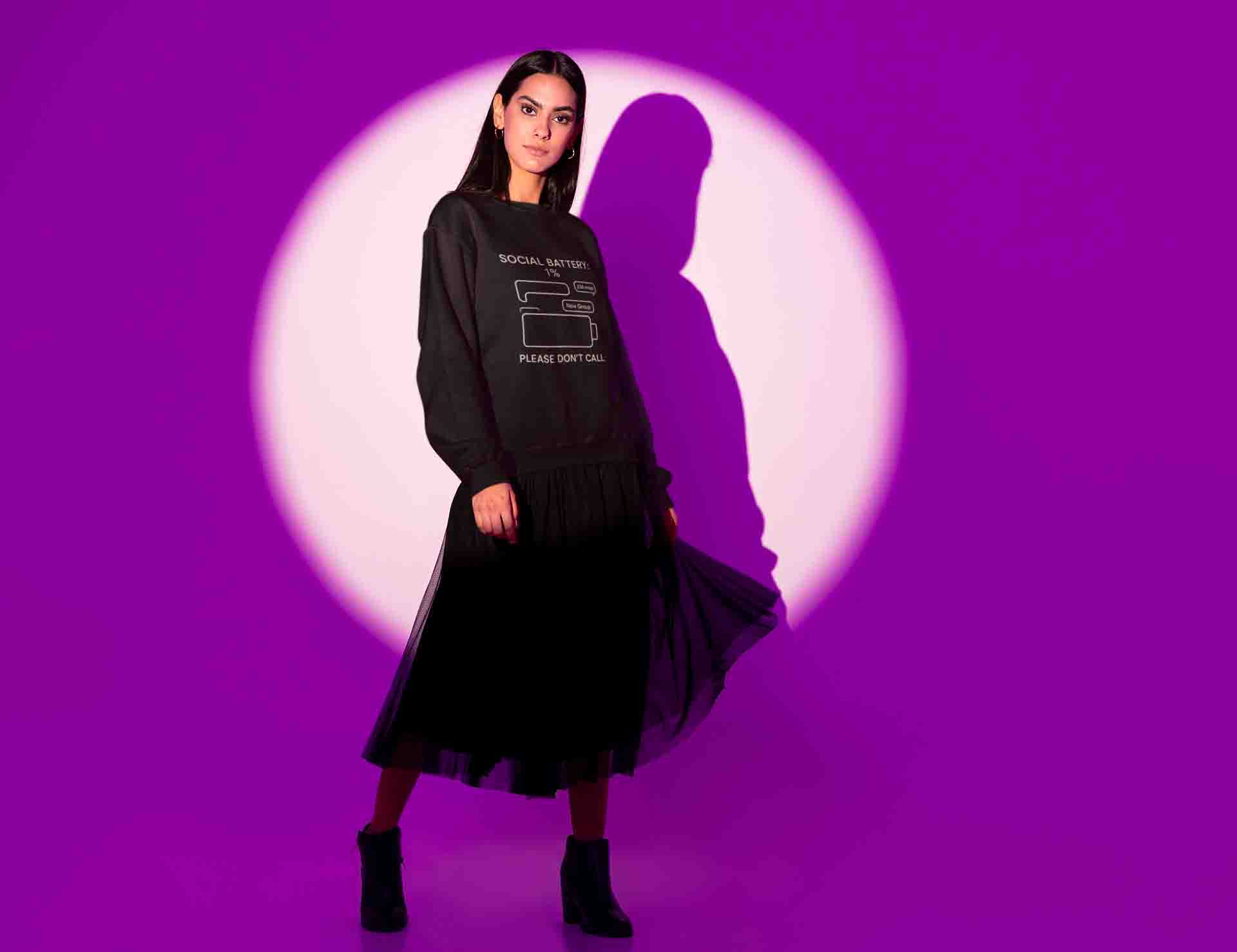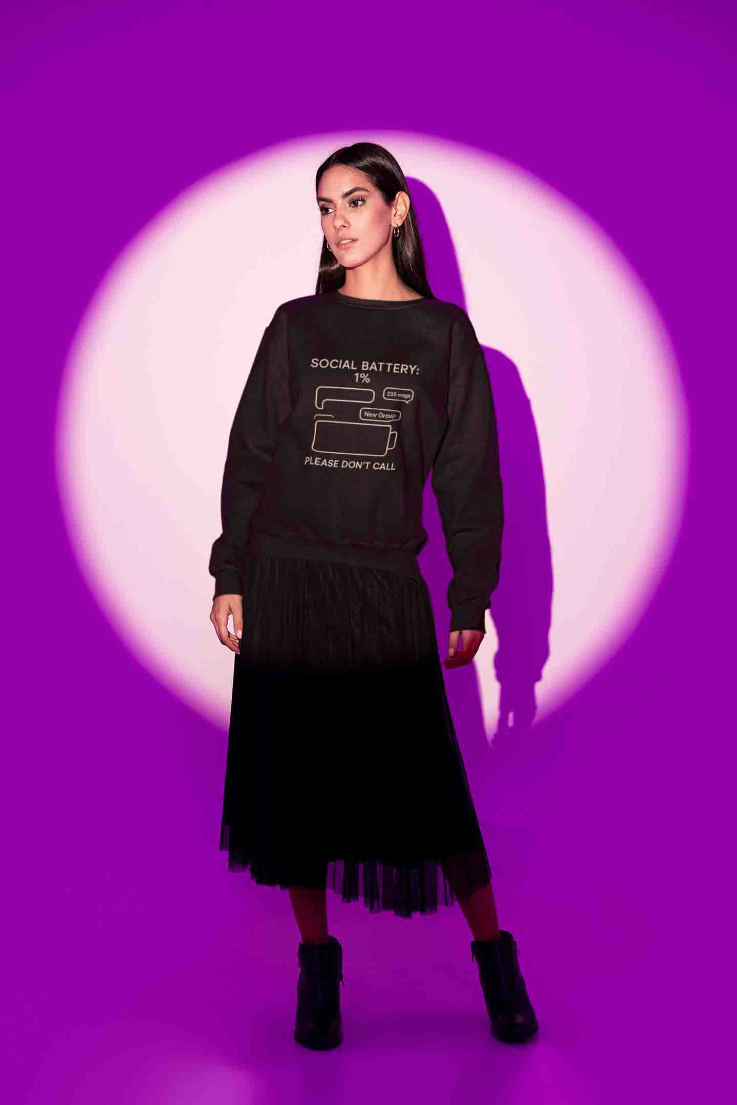 Social battery: 1%. Cozy crewneck energy for introvert icons. Soft, easy, and silently hilarious—please don’t call.