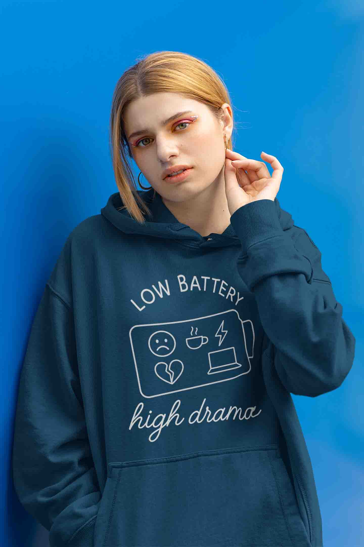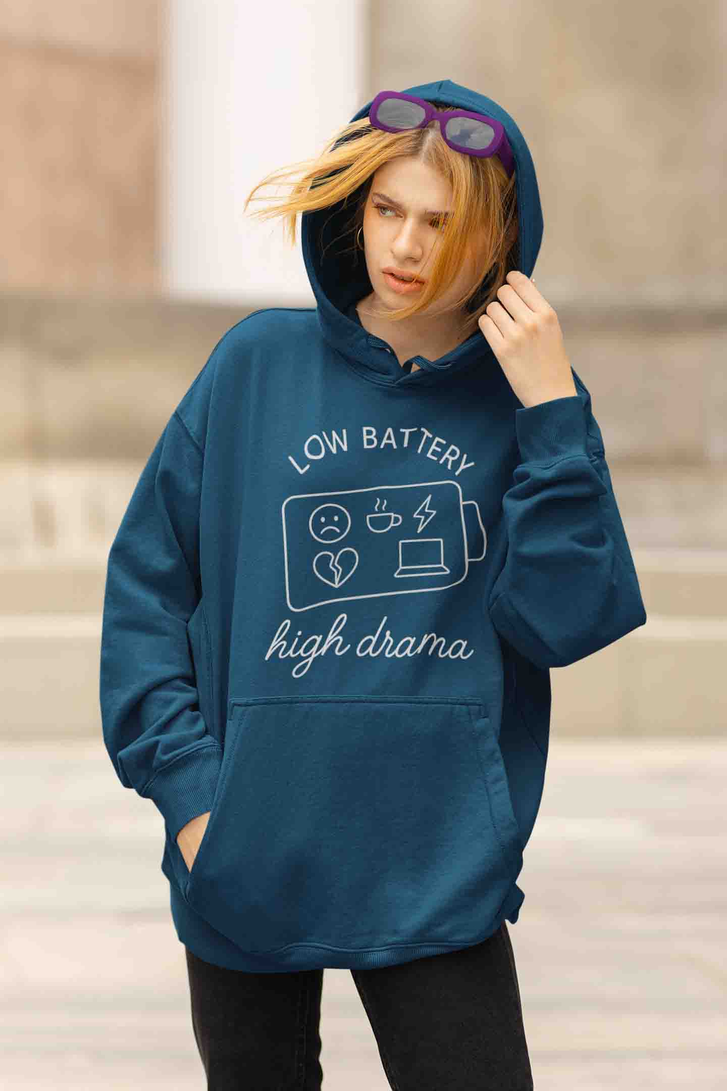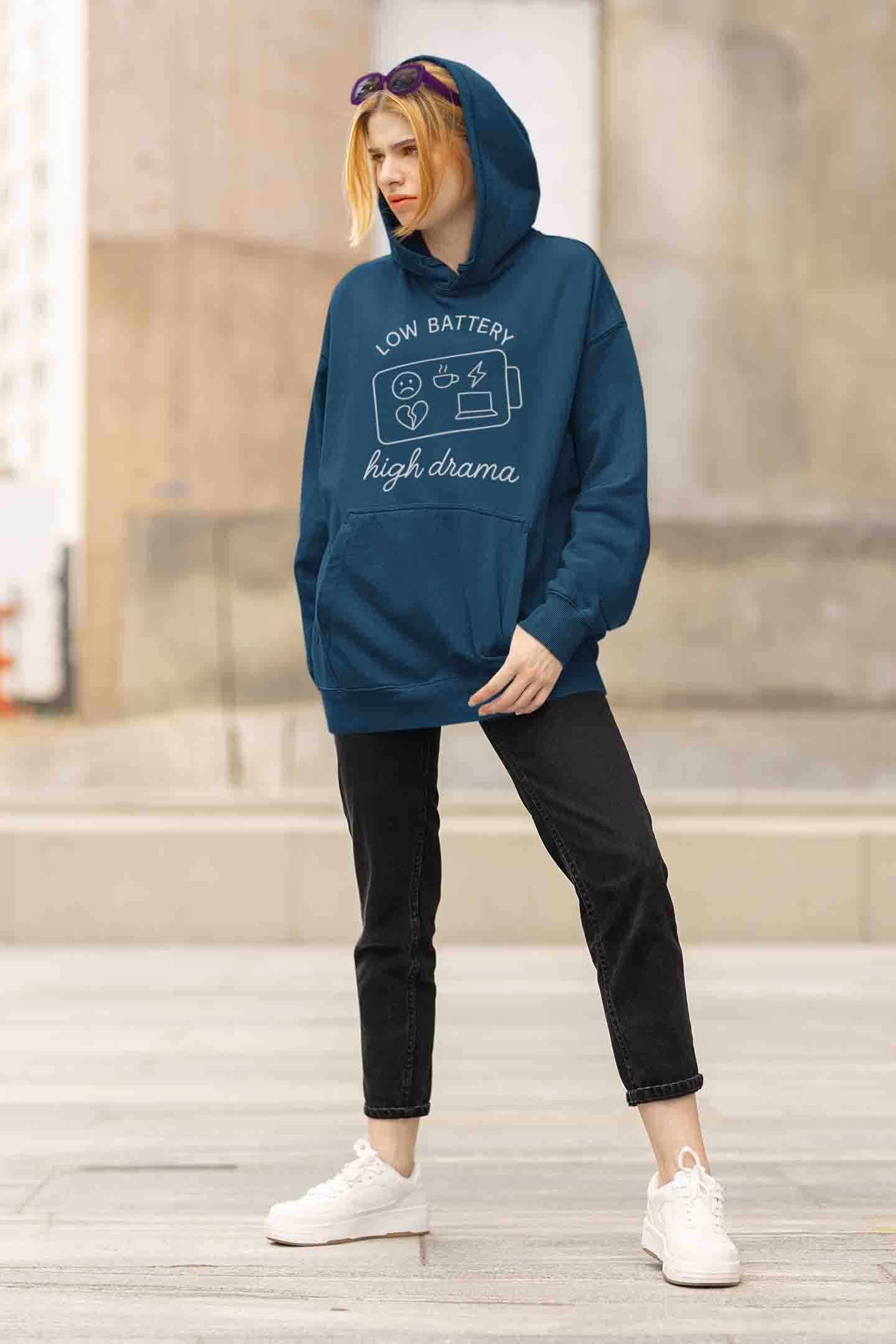 Low battery. High drama. Women’s navy oversized hoodie—soft, slouchy, and mood-approved. Throw it on, turn heads, stay cozy.