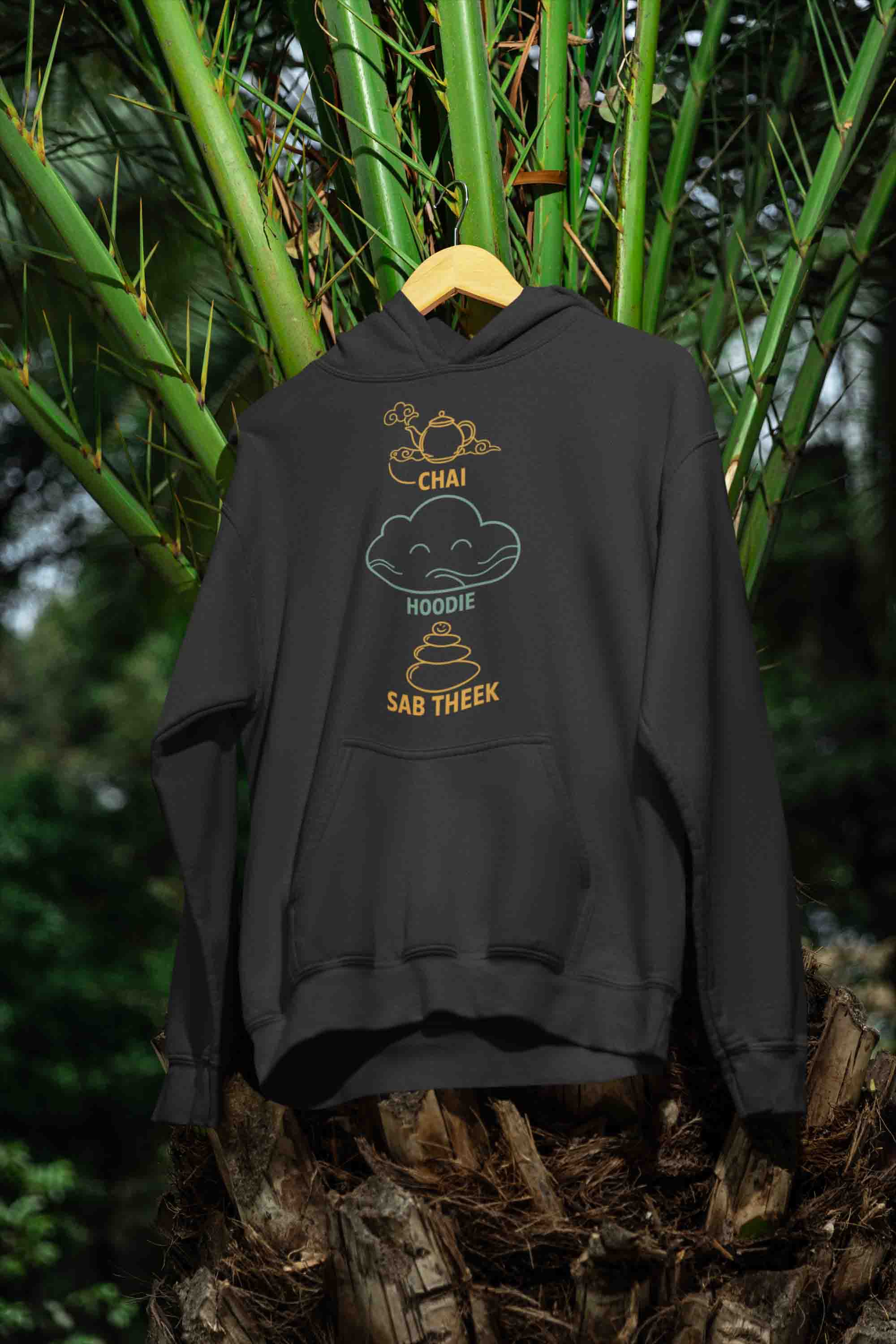 Chai. Hoodie. Sab theek. A black oversized hoodie made for cozy moods, chai breaks, and effortless desi-cute street style.