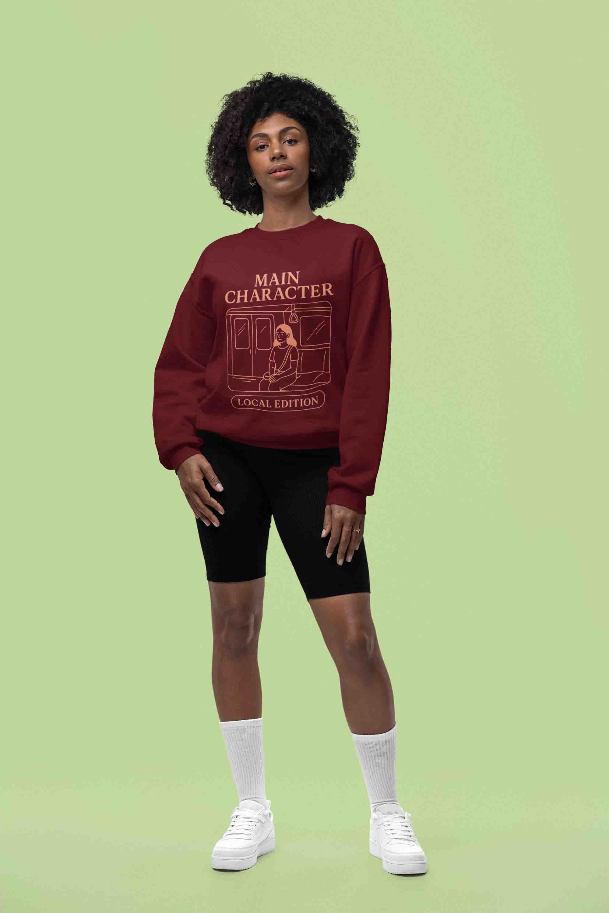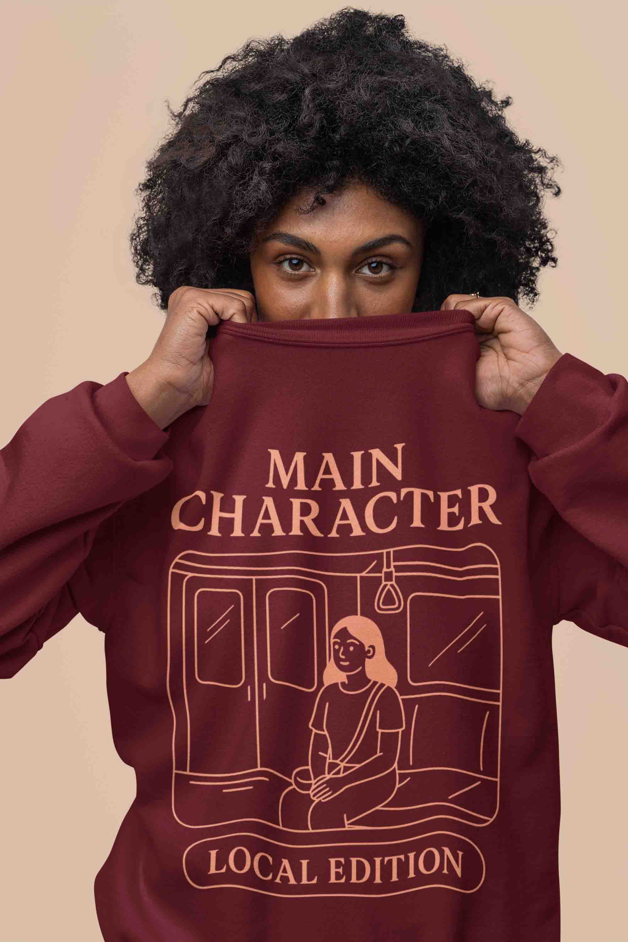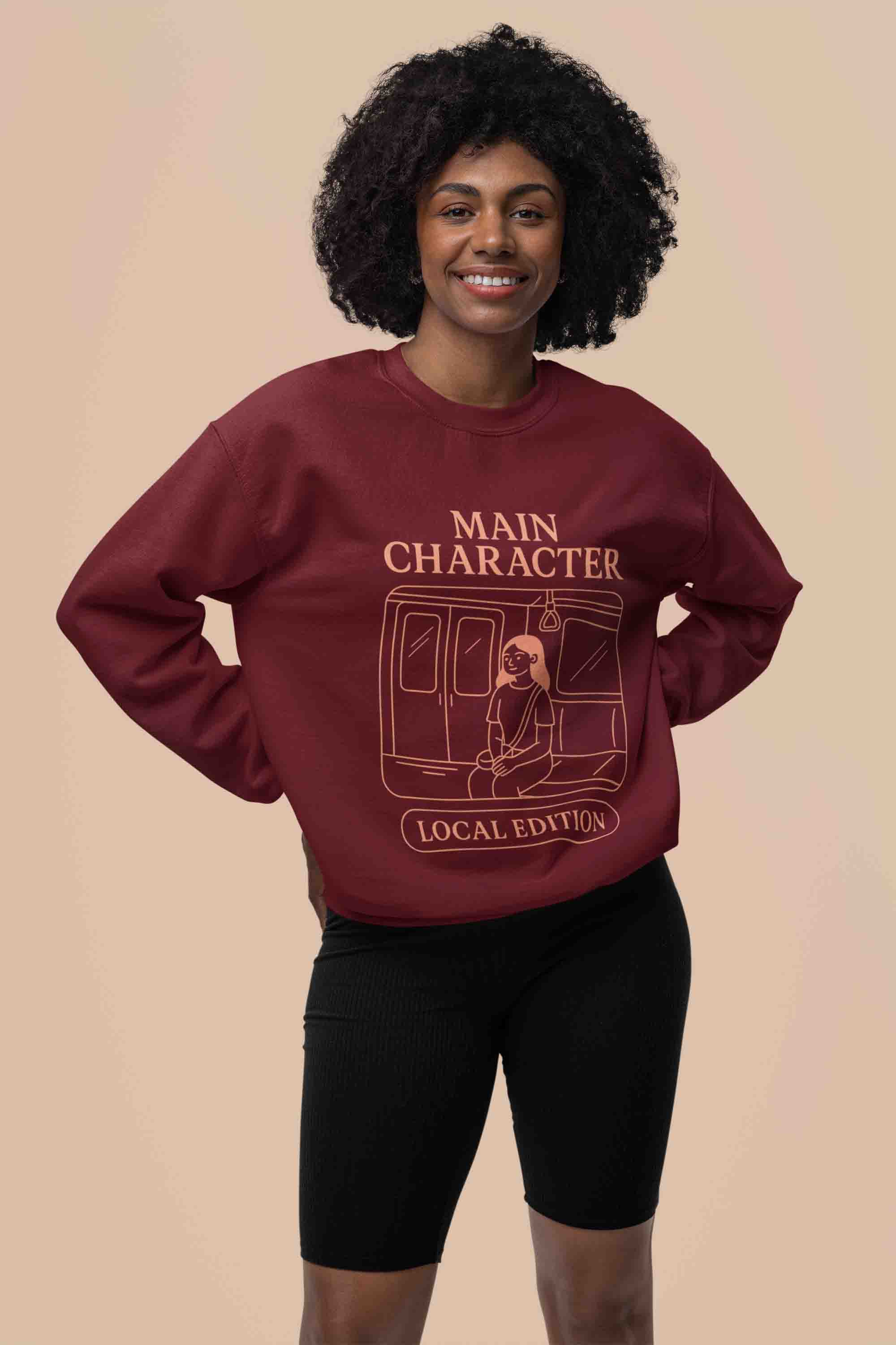 Maroon “Main Character” sweatshirt—soft, cozy, and confidence-ready. Wear your plot armor daily.