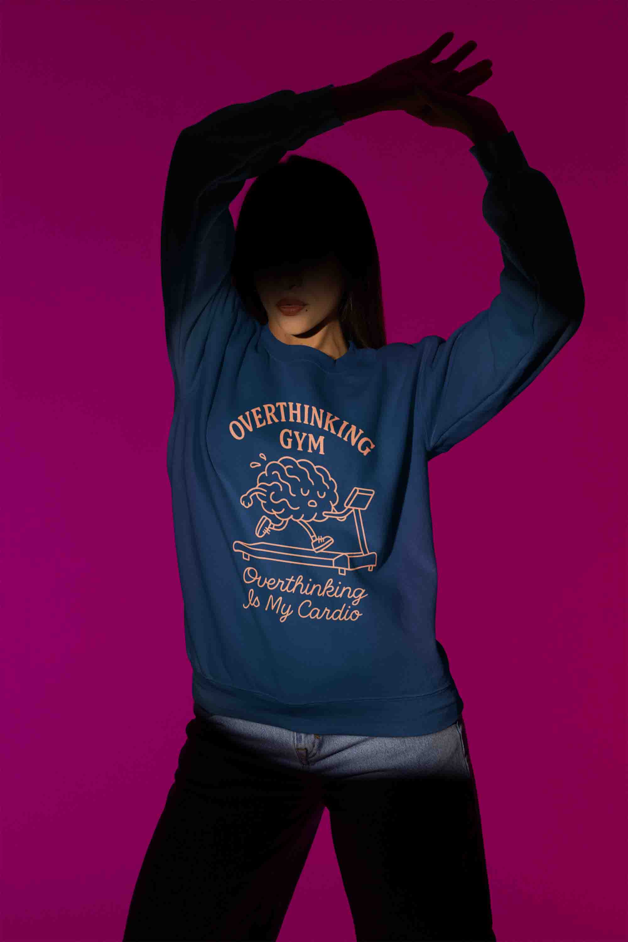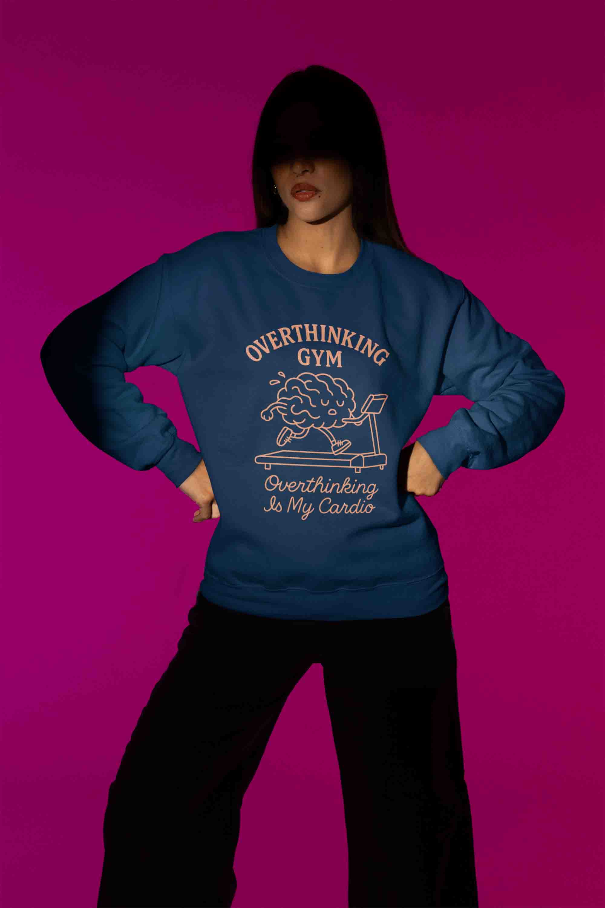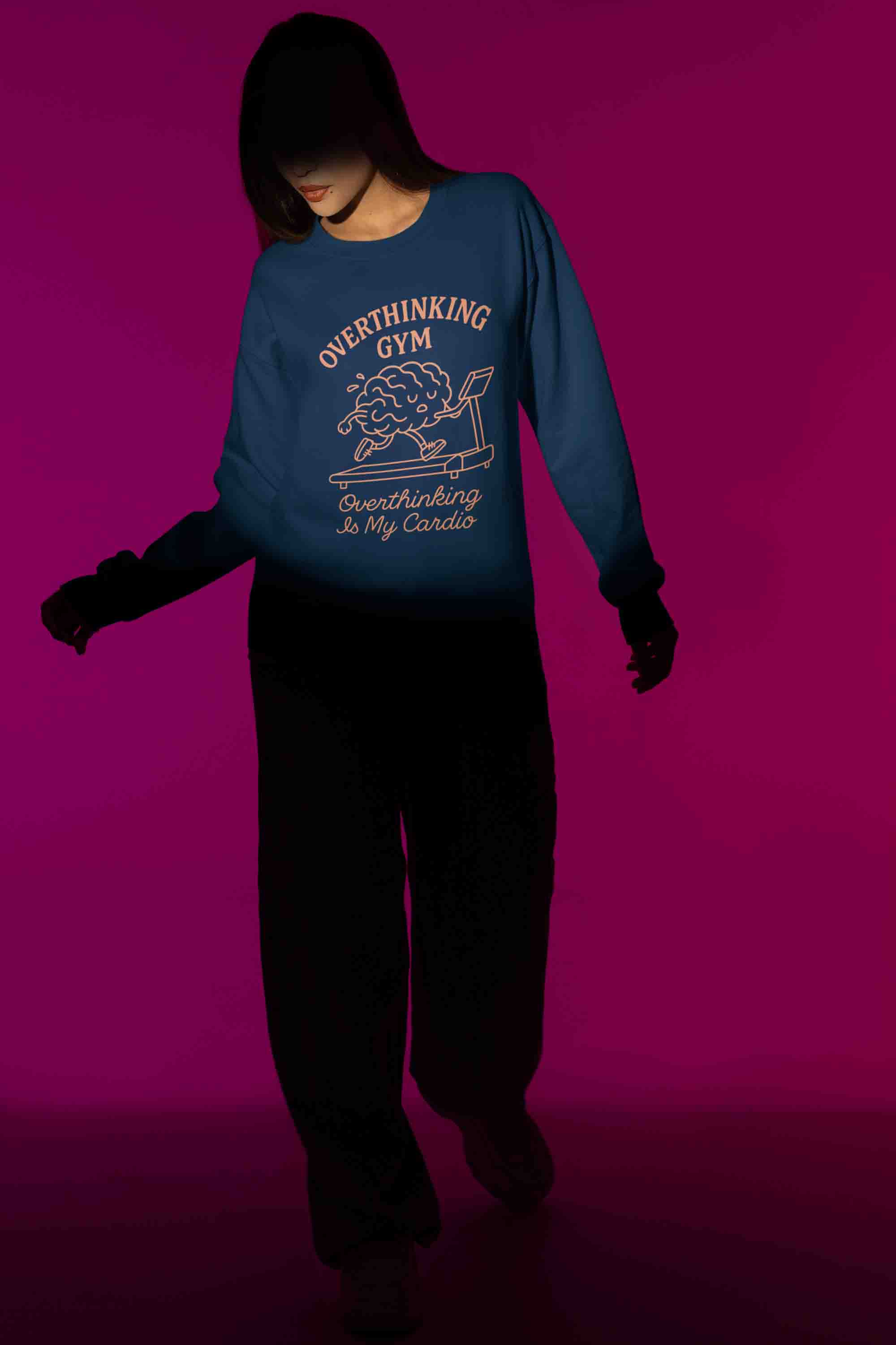 Women’s navy crewneck: “Overthinking Gym”—because your brain does the cardio. Soft, cozy, and mood-approved.