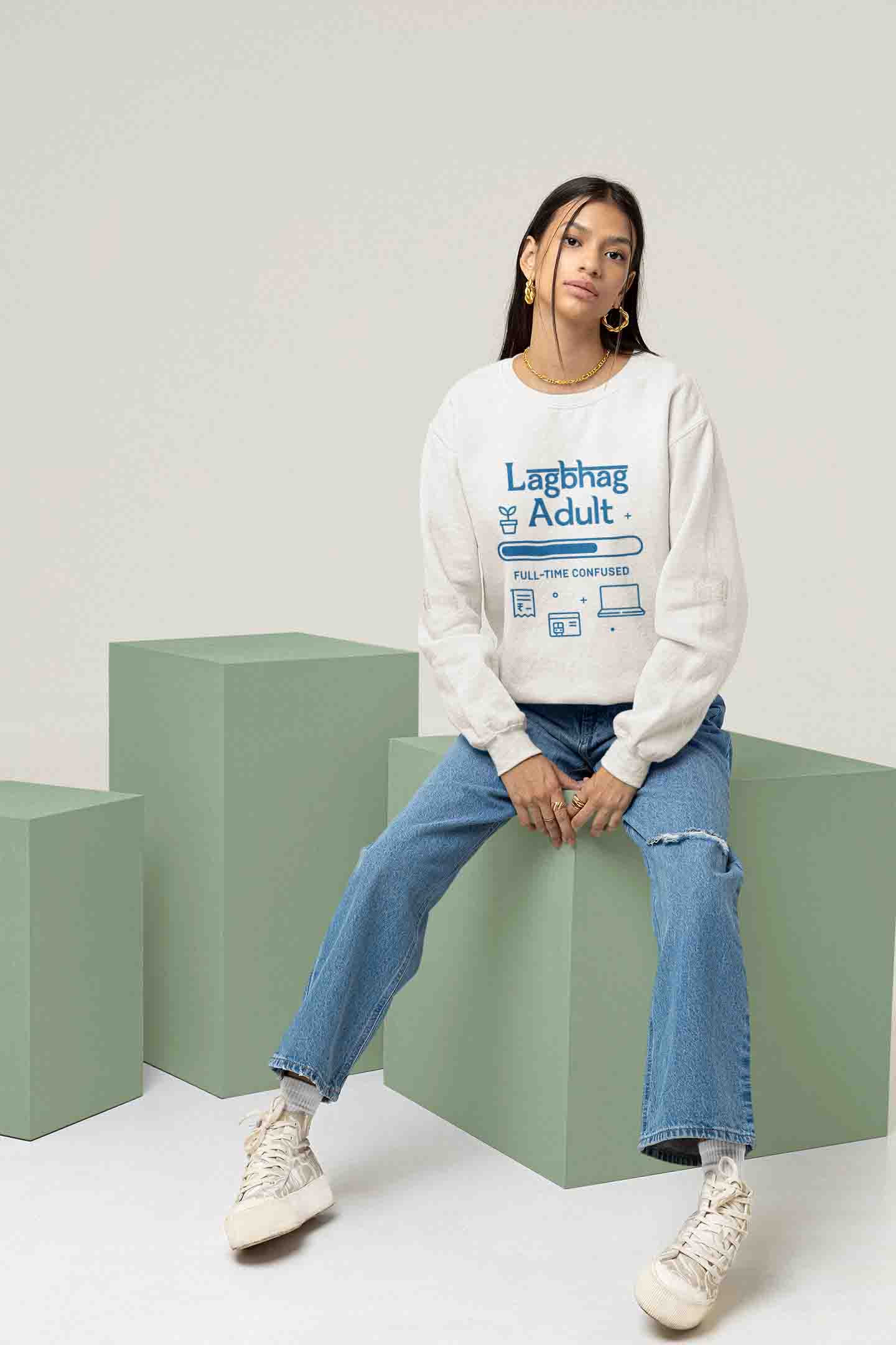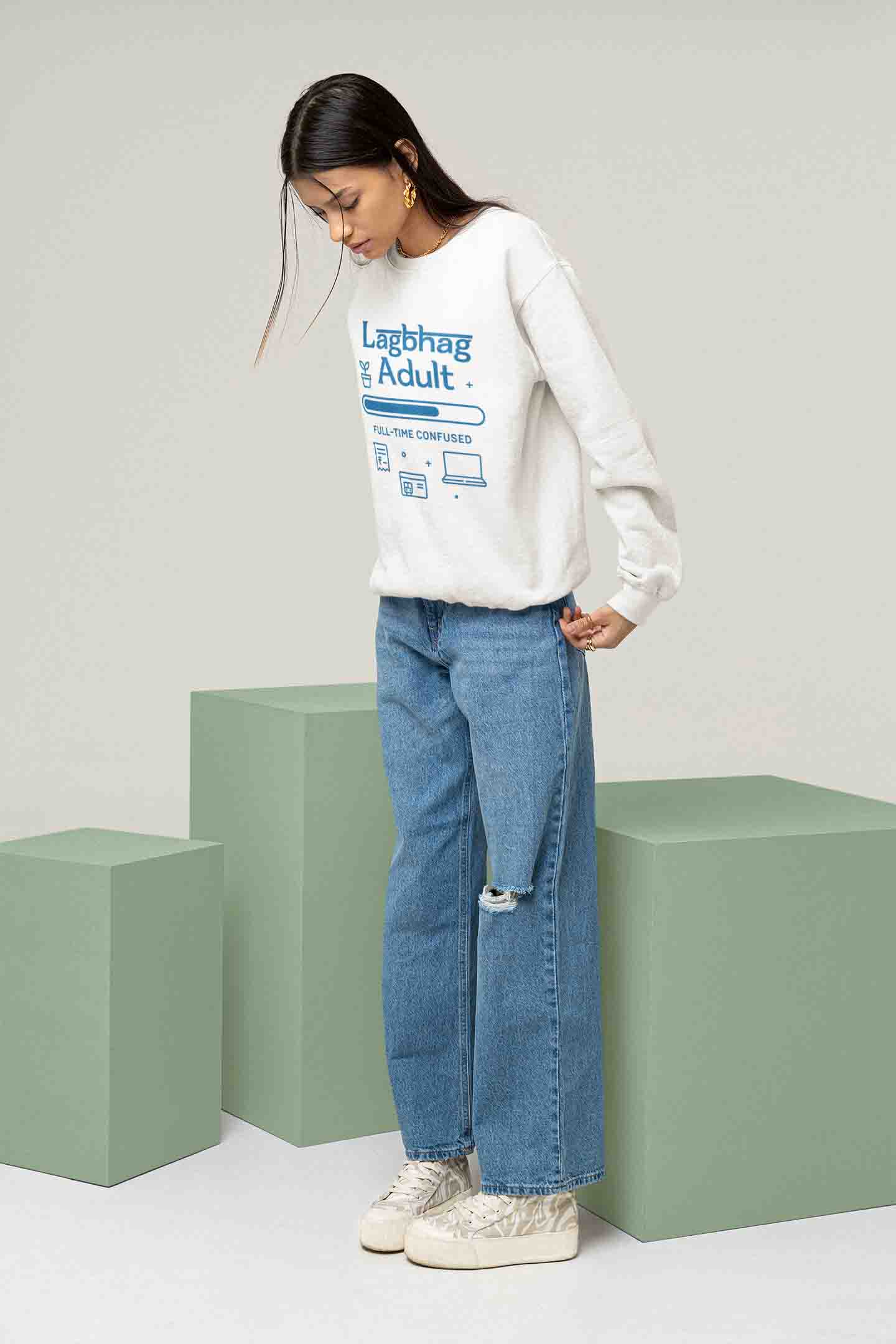 Lagbhag Adult—full-time confused. Cozy white sweatshirt for chaotic queens who run on coffee, tabs, and vibes.